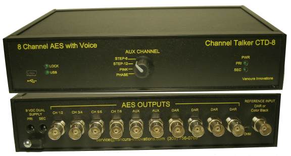 Digital Audio Test Equipment – The CTD-8 makes it possible for one person to setup or verify all the AES/EBU digital audio channels in his facility – easily, quickly, and accurately. The unit produces a hands-free audible and visual sequential voice ID for each channel, eliminating the need for external generators or extra personnel to switch between sources. In addition to the voice ID’s, the CTD-8 includes AUX channel tones allowing both narrow and wide band frequency response testing, and for spectrum analyzers, a pink noise generator is included. Finally, there is a modified sine wave output that can be monitored at the audio system output to verify that there has not been an audio phase reversal in the system. Audio phasing or polarity can be verified either visually (oscilloscope or hand-held video scope) or with an approved polarity detector (CL-1 Channel Listener). Channel Talker Specifications: 8