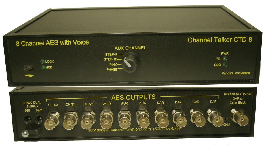 (Dealer inquiries welcome) Channel Talker CTD-8: $1695 each. Includes CTD-8, two 9VDC adapters. Optional USB Cable: $9.95. Standard 1.8M USB-A to USB-mini 5-pin cable. Optional Factory Programmed Custom Message To Your Specification: $150. Optional Rack Mount Kit: 1U high black Half rack adapter CTD-HRMK: $120 . Includes blank panel, mounting ears, and screws for assembly. Shipping: Continental USA ground shipping $11.00. Other shipping arrangements available.