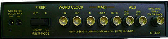 MADI Output: 64 Channels embedded on 125Mb serial digital channel. Outputs on COAX and FIBER. Signal is locked to Word Clock. Fiber: SC connector, 1300nm wavelength. COAX: 600mv into 75 ohms.